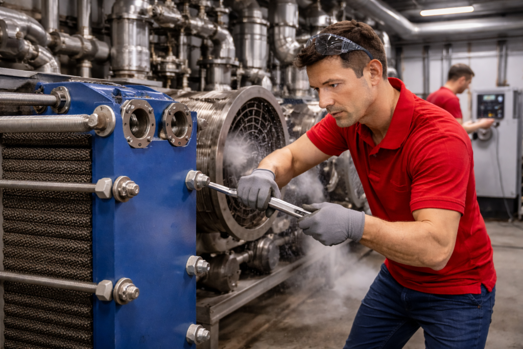 Die Kosten variieren: Dichtungswechsel beim Plattenwärmetauscher ca. 500–2.000 €, Plattenersatz 2.000–8.000 €, chemische Reinigung 800–3.000 €, Rohrbündelwechsel 5.000–20.000 €. Nach Inspektion erhalten Sie einen transparenten Kostenvoranschlag.
